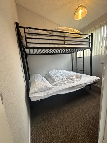 Our chalets are double glazing throughout. The main bedroom has a double bed and wardrobe space. The smaller bedroom has a bunk bed. There is electric heating - a fire with a range of settings in the living area, heated towel rail in the shower room and wall heaters.