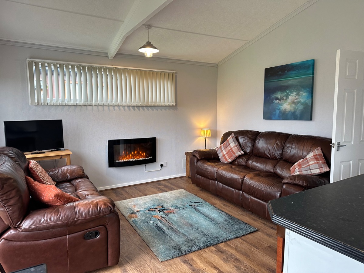 - Open plan living area with comfy sofas , electric fire, and smart TV.