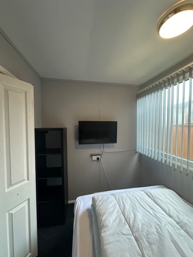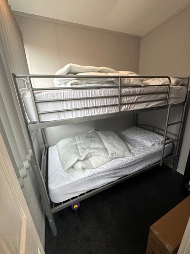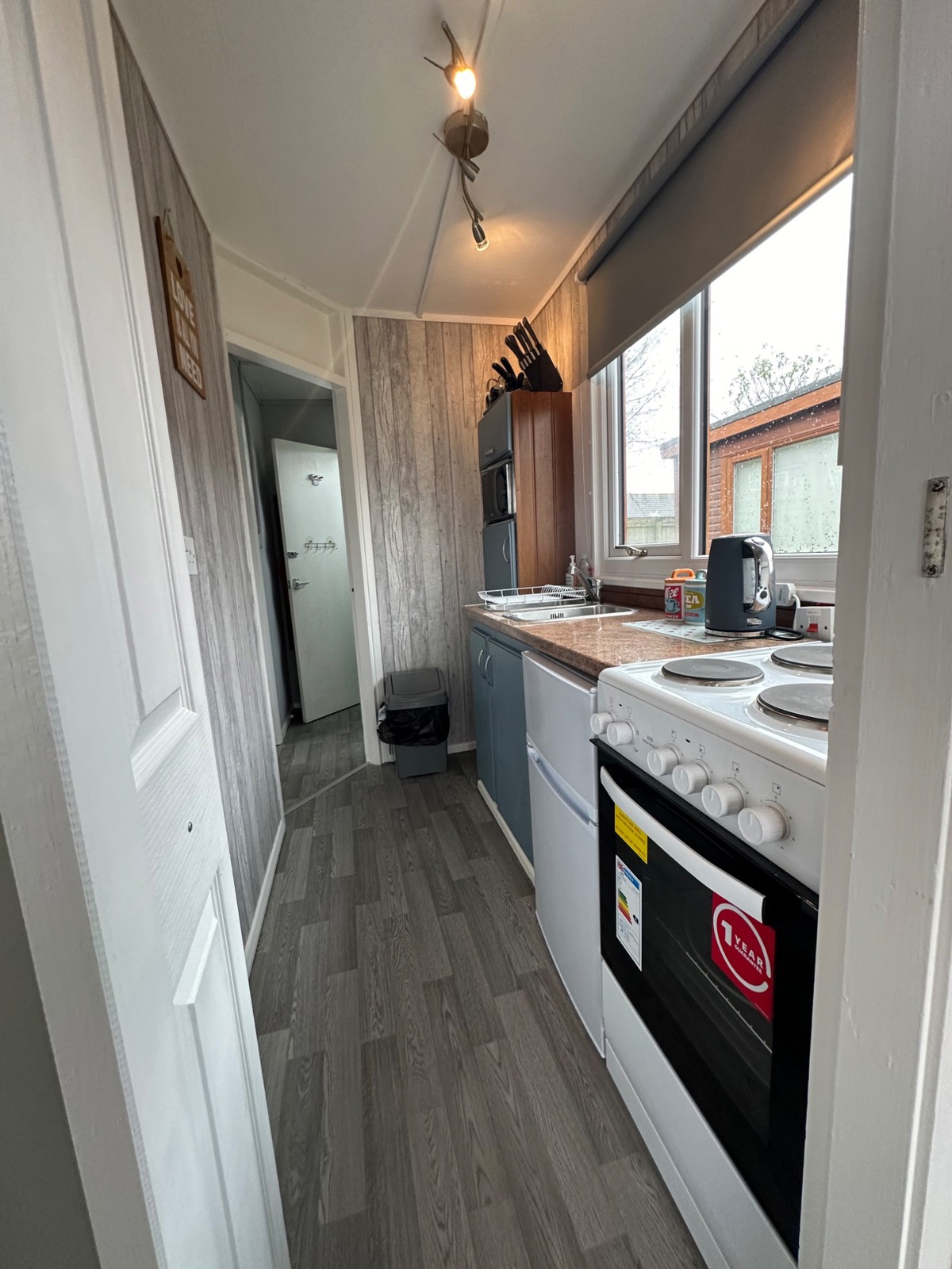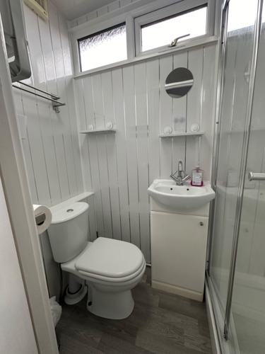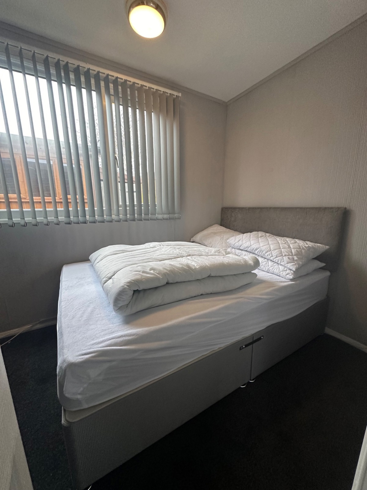 Our chalets are double glazing throughout. The main bedroom has a double bed and storage. The smaller bedroom has a bunk bed. There is electric heating - a fire with a range of settings in the living area, heated towel rail in the shower room and wall heaters.