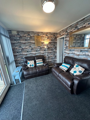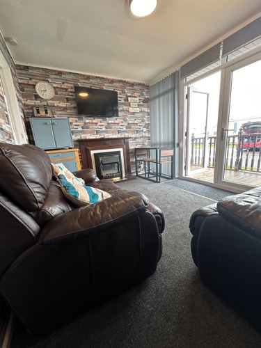 - Open plan living area with comfy sofas , electric fire, and TV.